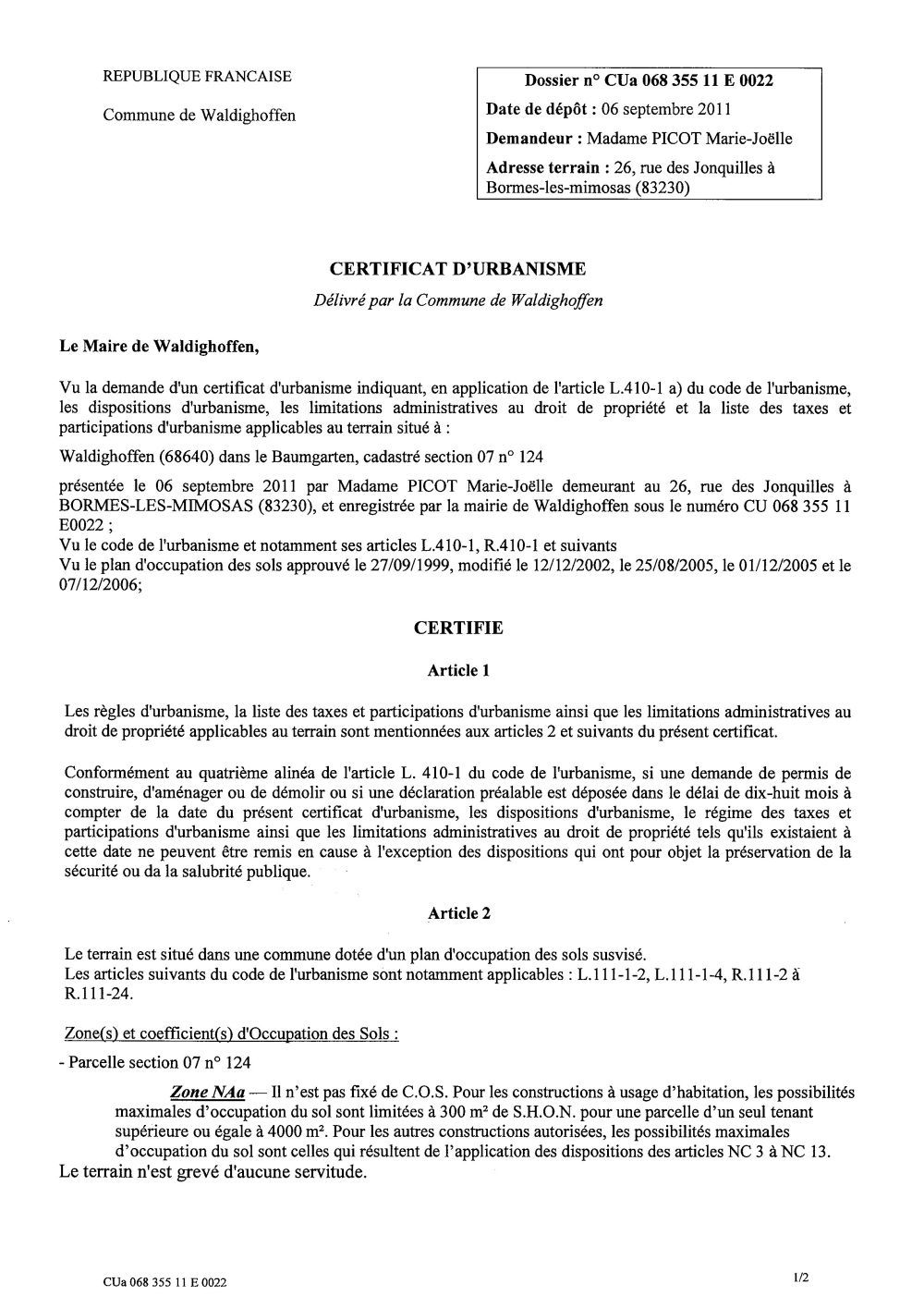 Un certificat d'urbanisme a été établi pour Madame PICOT Marie-Joëlle, pour un terrain situé dans le "Baumgarten"