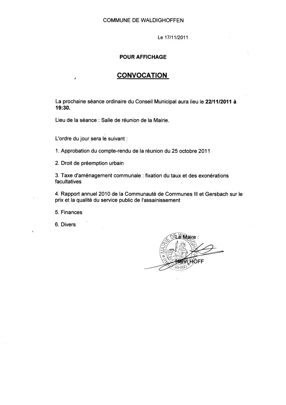 Vous êtes ici : Accueil Mairie Affichage public Annexes affichage public 2011 Convocation Conseil Municipal le 22.11.2011