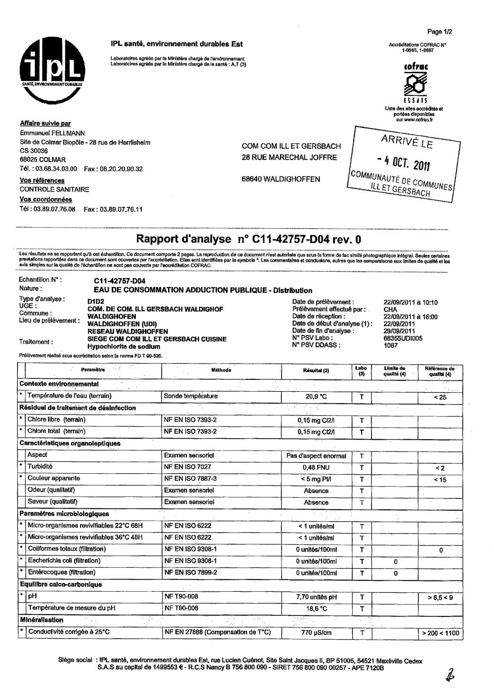 Rapport d'analyse d'eau potable n°C11-42757-D04 du 29/09/201