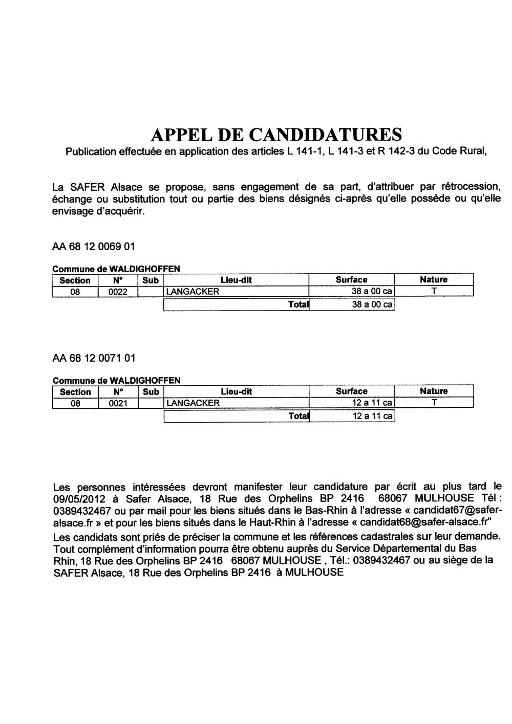 La SAFER Alsace se propose, d'attribuer par rétrocession, échange ou substitution tout ou une partie des biens dans le lieu-dit "Langacker".