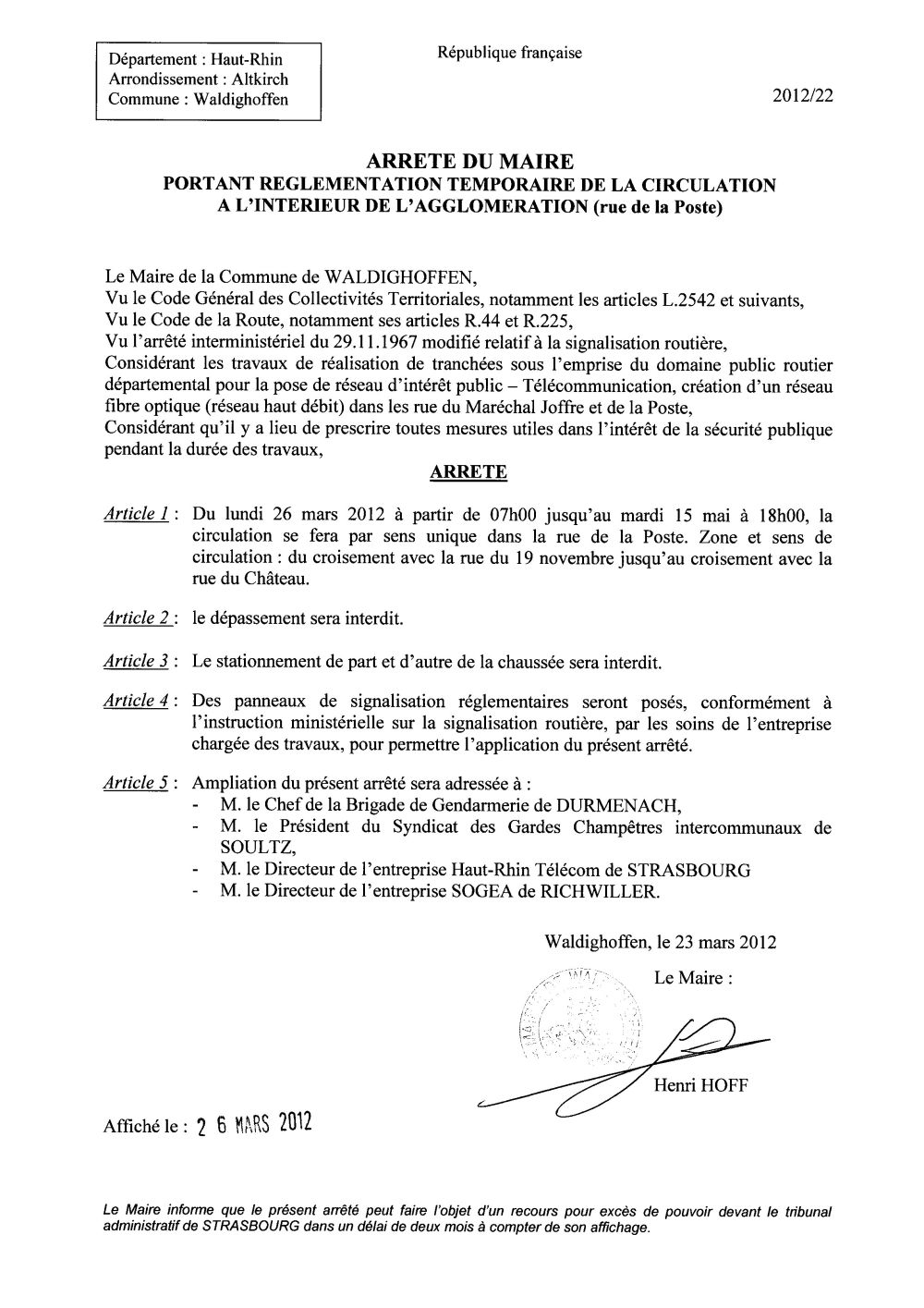 Arrêté du Maire n° 2012/22 portant règlementation temporaire de la circulation rue de la Poste du lundi 26 mars au mardi 15 mai 2012.