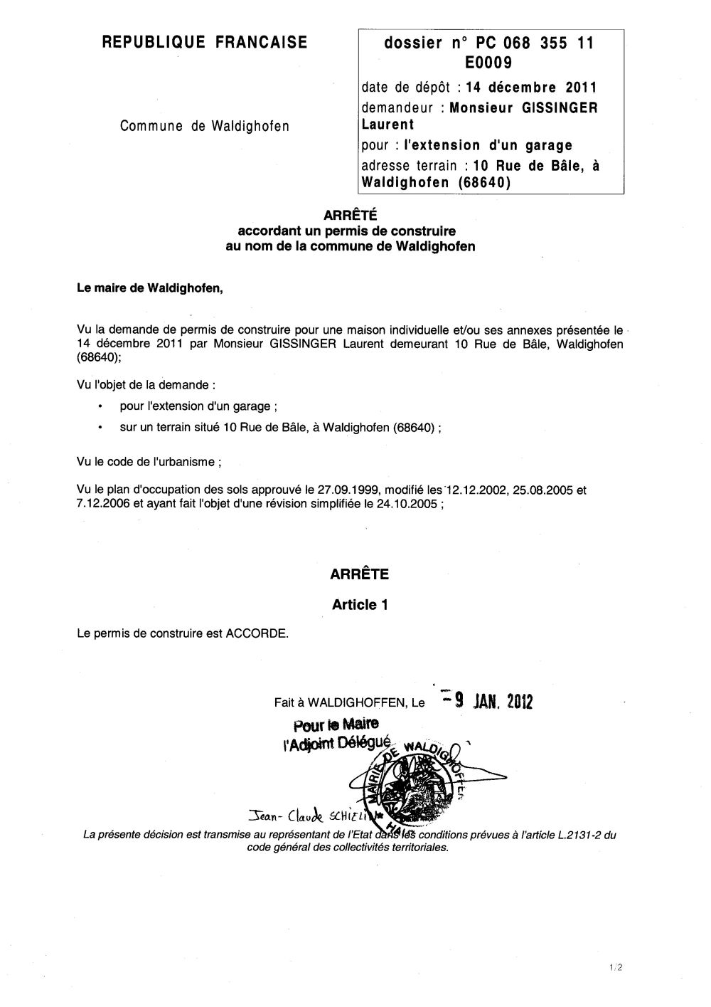 Vous êtes ici : Accueil Mairie Affichage public Annexes affichage public 2012 Arrêté du permis de construire n°11E0009 - M. GISSINGER