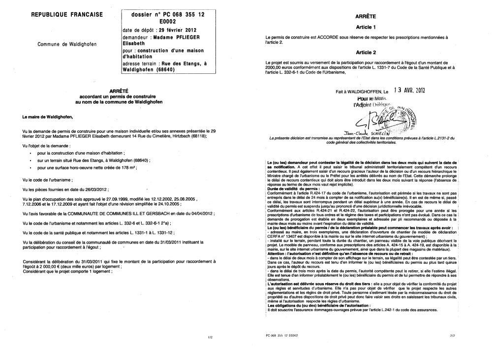 Arrêté du permis de construire n°12E0002 - Mme PFLIEGER