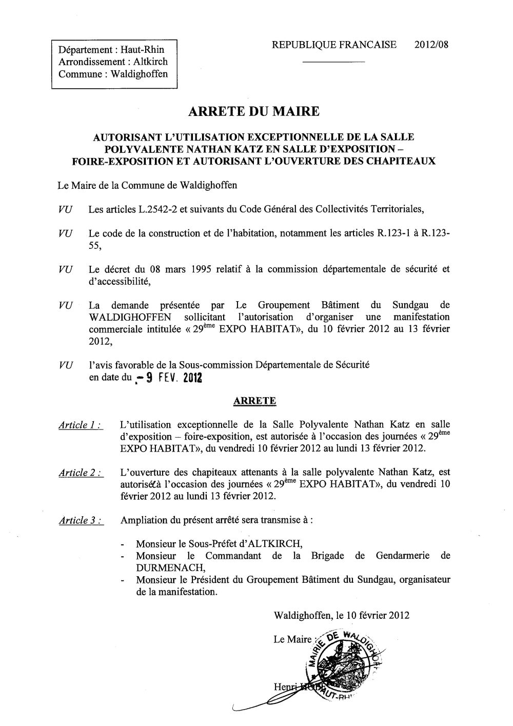 Arrêté n° 2012/08 autorisant l'utilisation exceptionnelle de la Salle Polyvalente et l'ouverture des chapiteaux à l'occasion de la 29ème Expo-habitat.