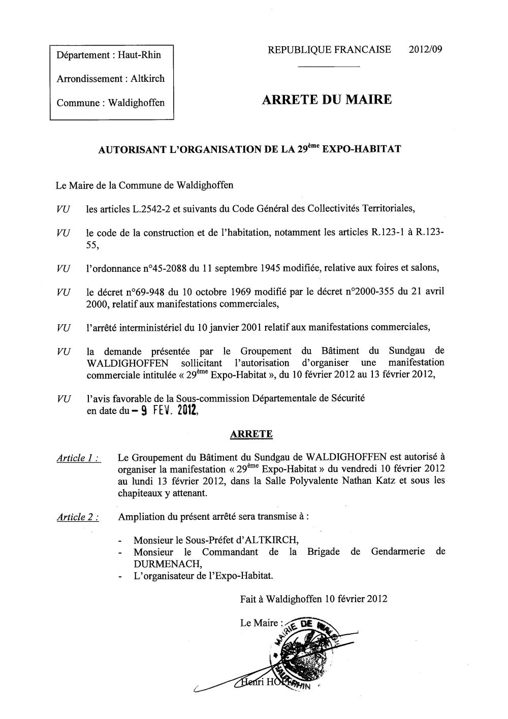 Arrêté n° 2012/09 - organisation Expo-habitat