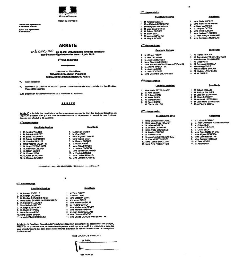 Arrêté n° 2012142-0007 du 21 mai 2012 fixant la liste des candidats aux élections législatives des 10 et 17 juin 2012.