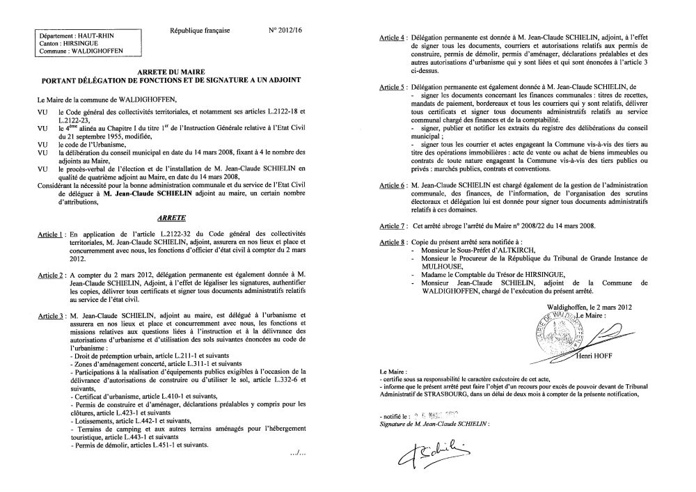 Vous êtes ici : Accueil Mairie Affichage public Annexes affichage public 2012 Arrêté portant délégation à M. SCHIELIN