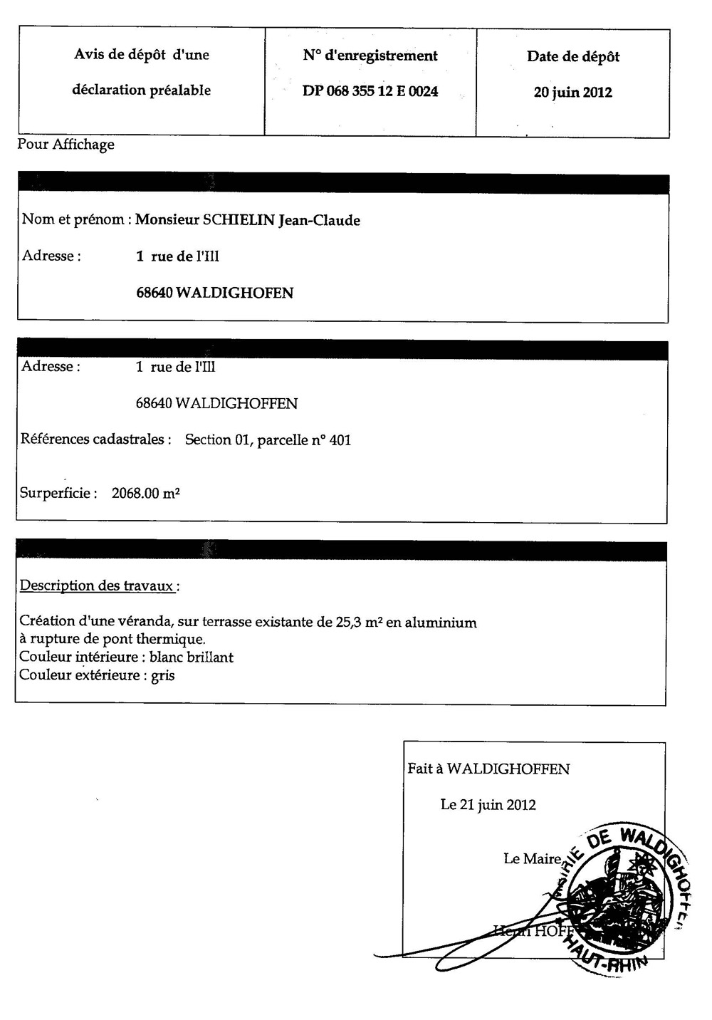 Avis de dépôt d'une déclaration prélable n°12 E 0024 - Schielin Jean-Claude