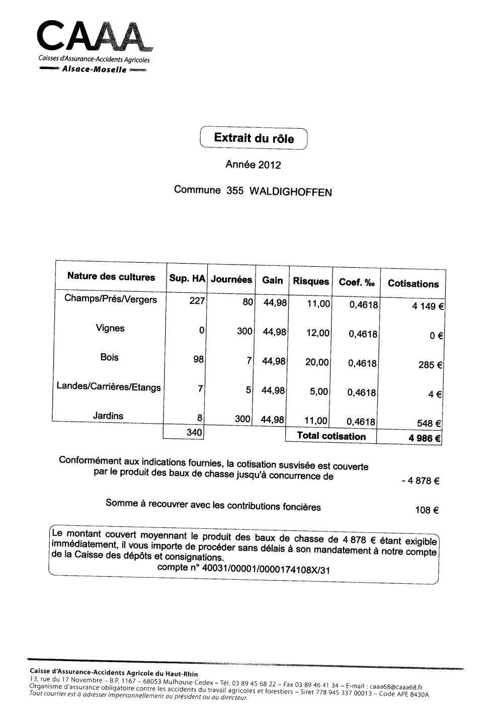 Extrait du rôle des cotisations de la Caisse d'Assurance-Accidents Agricoles pour l'année 2012