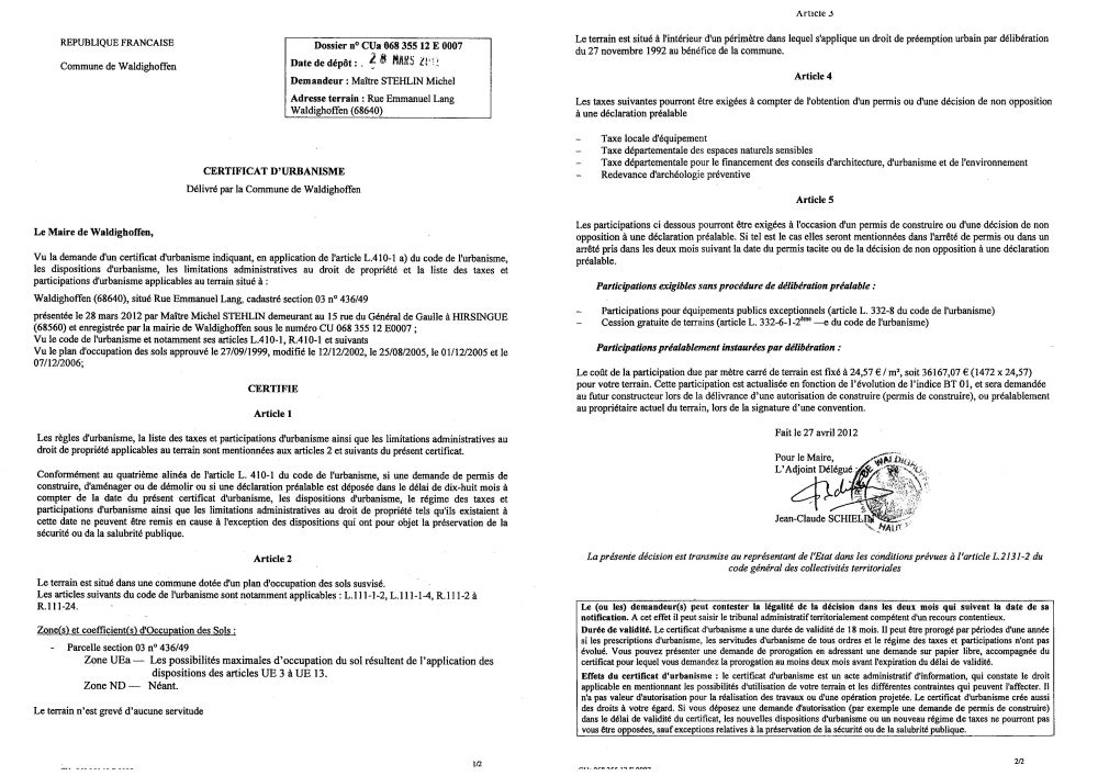 Certificat d'urbanisme n°12E0007 - Me STEHLIN