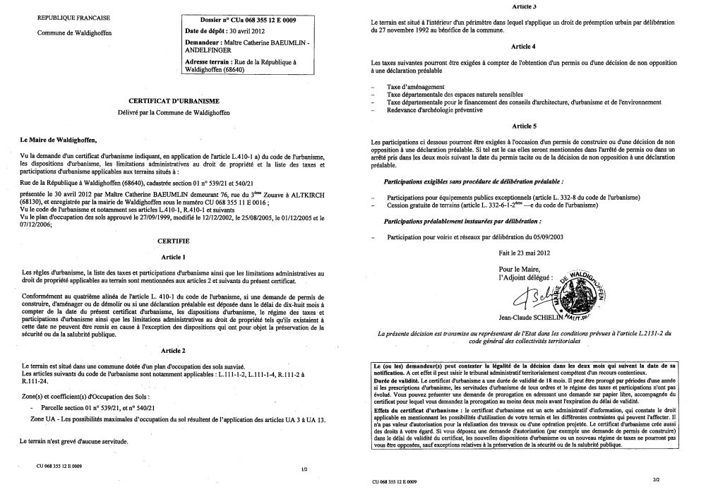 Un certificat d'urbanisme a été établi pour Maître Catherine BAEUMLIN - ANDELFINGER, concernant un terrain situé Rue de la République.