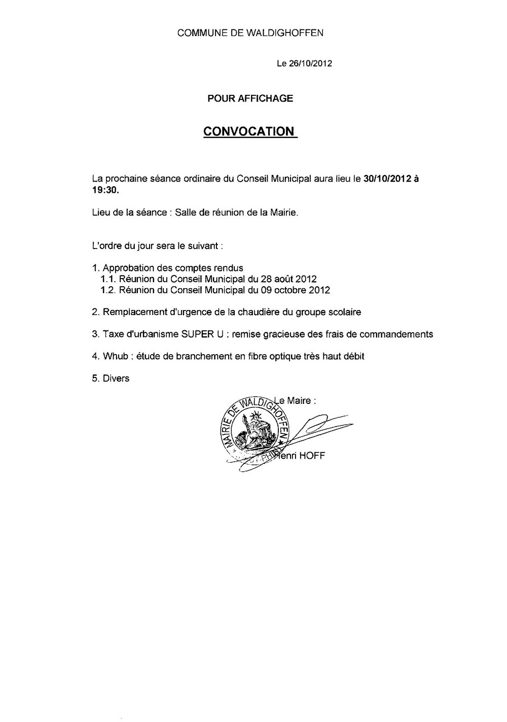 Convocation du Conseil Municipal de Waldighoffen en date du 30 octobre 2012.