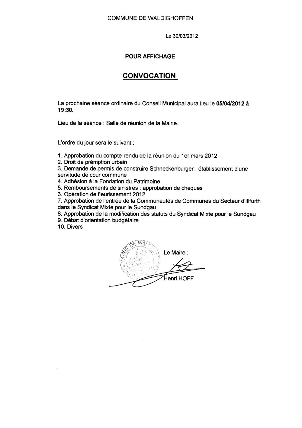 Vous êtes ici : Accueil Mairie Affichage public Annexes affichage public 2012 Convocation Conseil Municipal le 05.04.2012