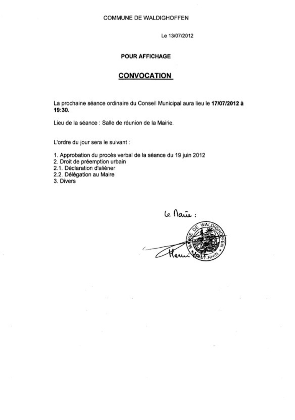 Convocation Conseil Municipal le 17.07.2012