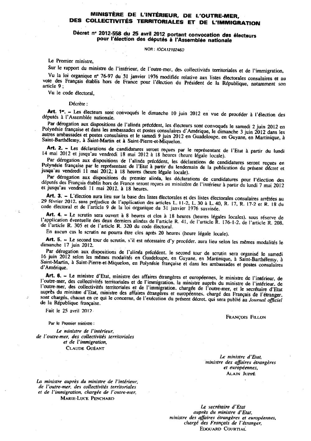 Décret 2012-558 du 25 avril 2012 portant convocation des électeurs pour l'élection des députés à l'Assemblée Nationale.