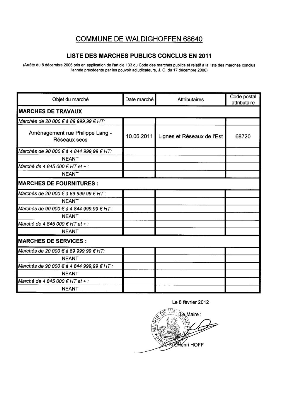 Vous êtes ici : Accueil Mairie Affichage public Annexes affichage public 2012 Liste des marchés publics conclus en 2011