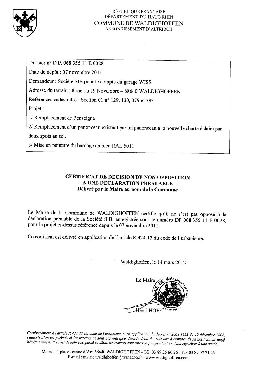 Avis de non opposition à la déclaration préalable de la Société SIB pour le compte du garage WISS.