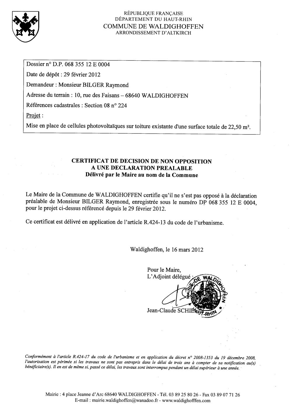 Non-opposition à la déclaration préalable n°12E0004 - M. BILGER