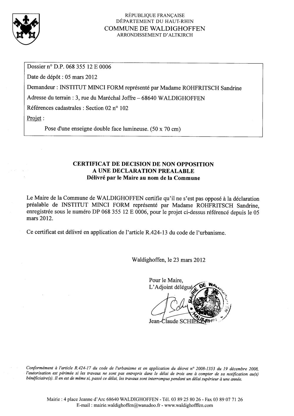 Non-opposition à la déclaration préalable n°12E0006 - INSTITUT MINCI FORM