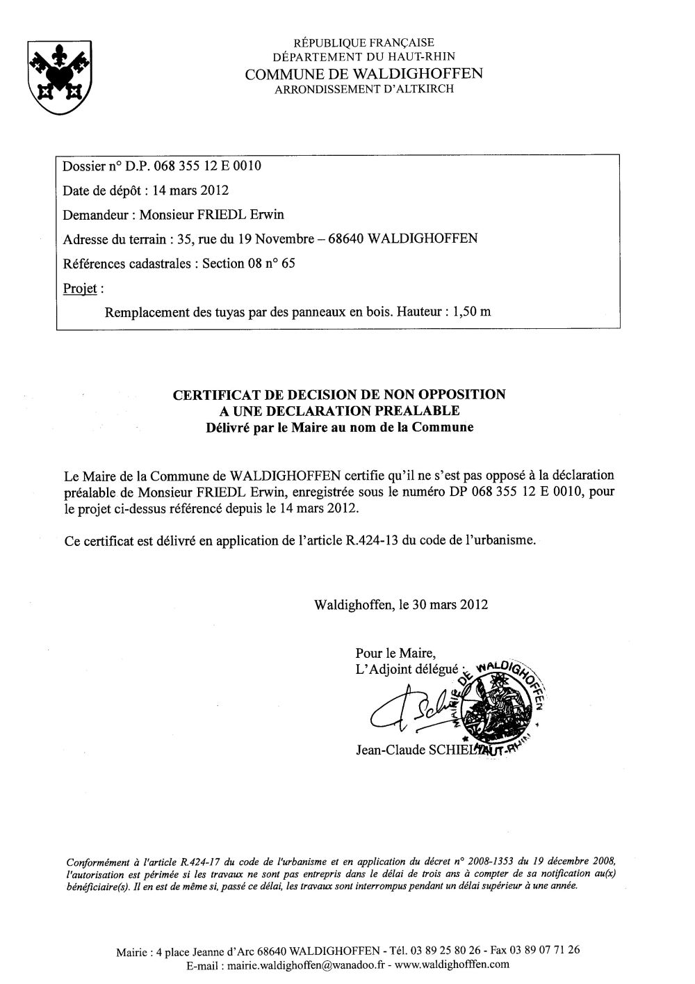 Vous êtes ici : Accueil Mairie Affichage public Annexes affichage public 2012 Non-opposition à la déclaration préalable n°12E0010 - M. FRIEDL