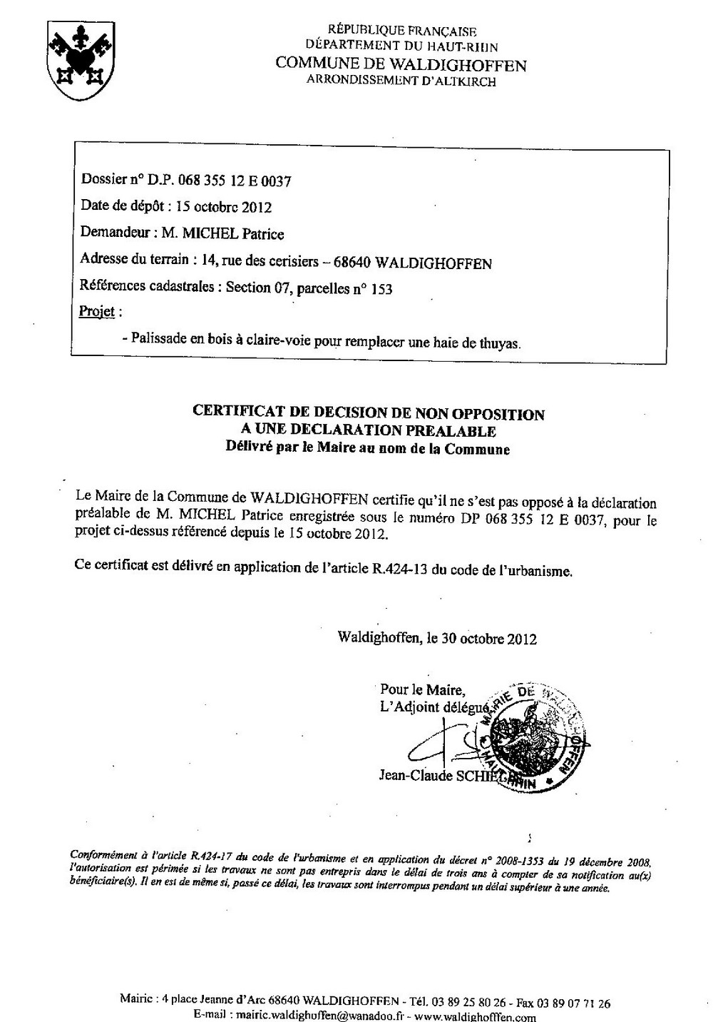 Non-opposition à la déclaration préalable n°12E0037 - M. MICHEL