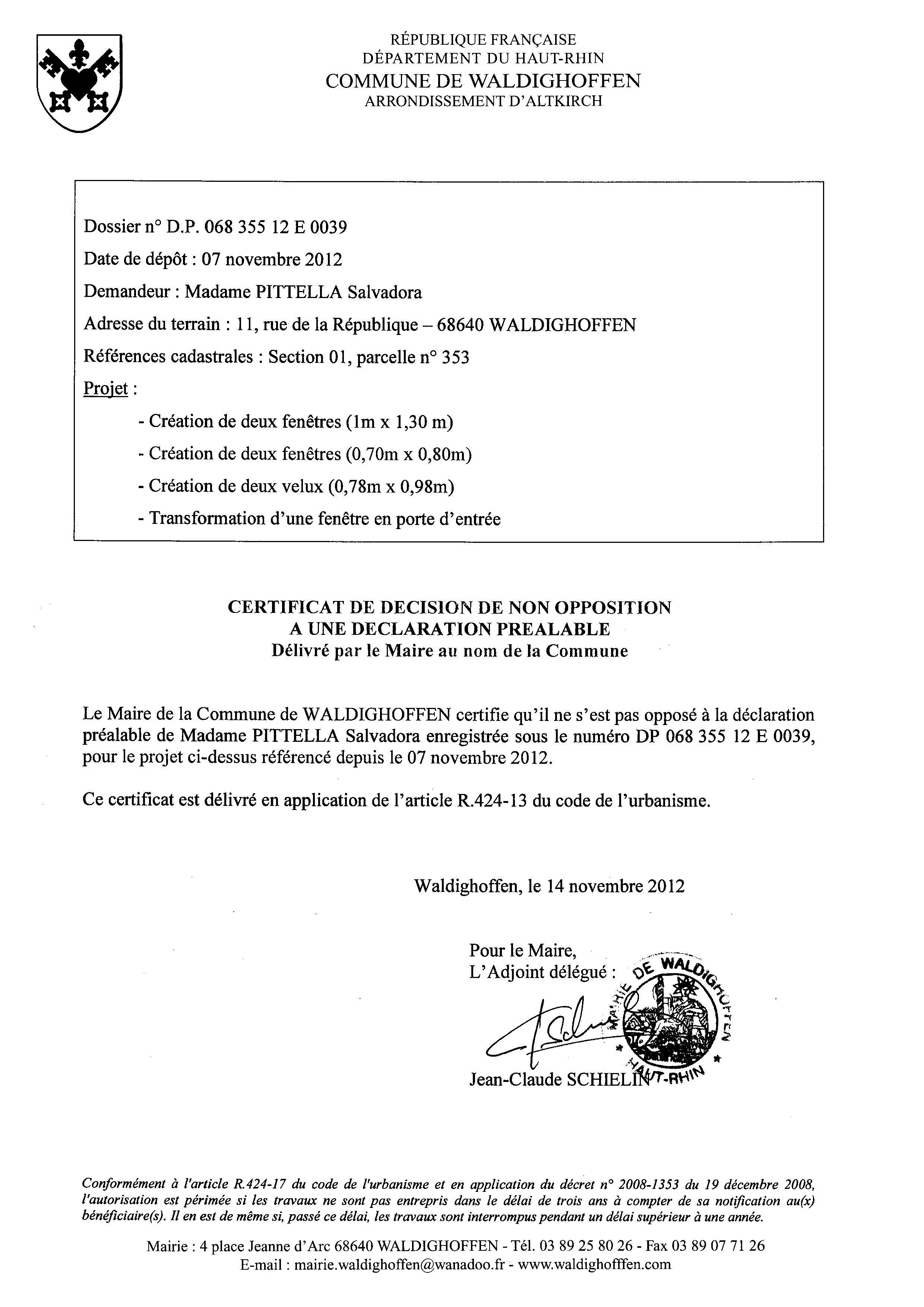 Avis de non opposition à la déclaration préalable de Madame PITTELLA