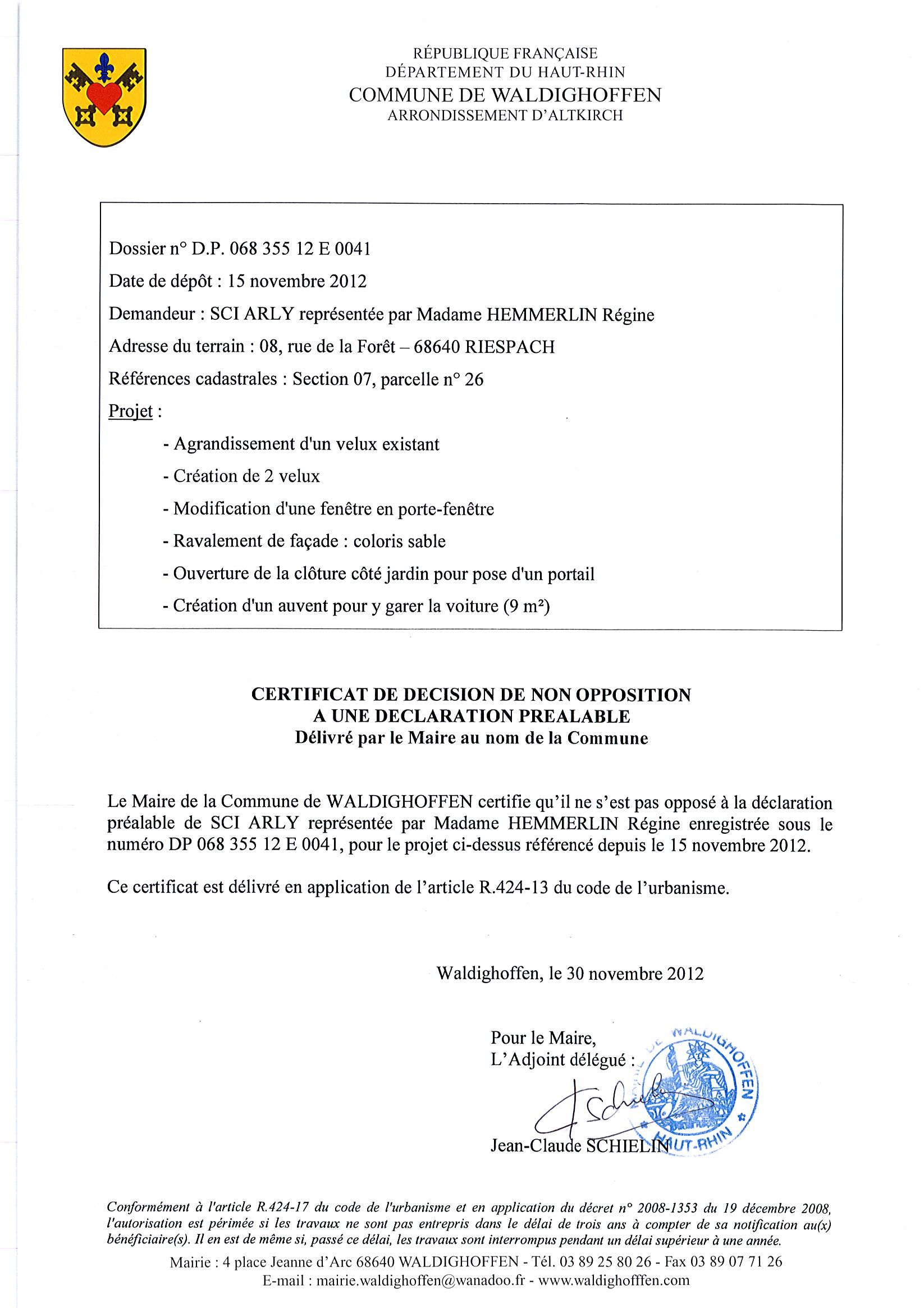 Non-opposition à la déclaration préalable n°12E0041 - Mme HEMMERLIN