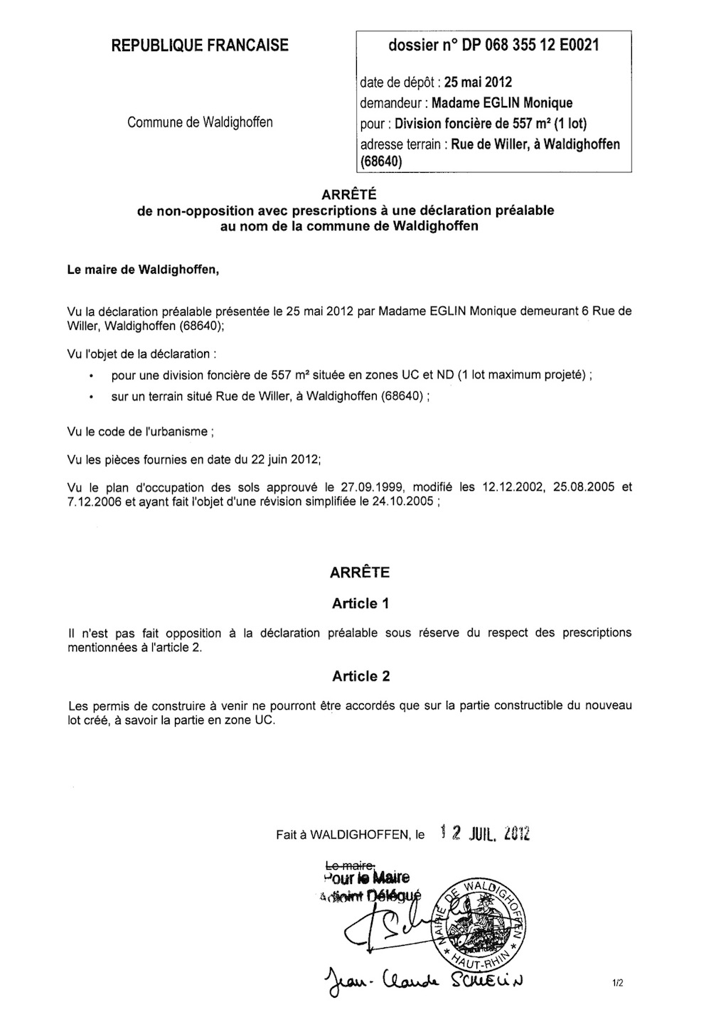 L'arrêté de non opposition pour la déclaration préalable n° DP 068 355 12 E 0021 de Madame EGLIN Monique.