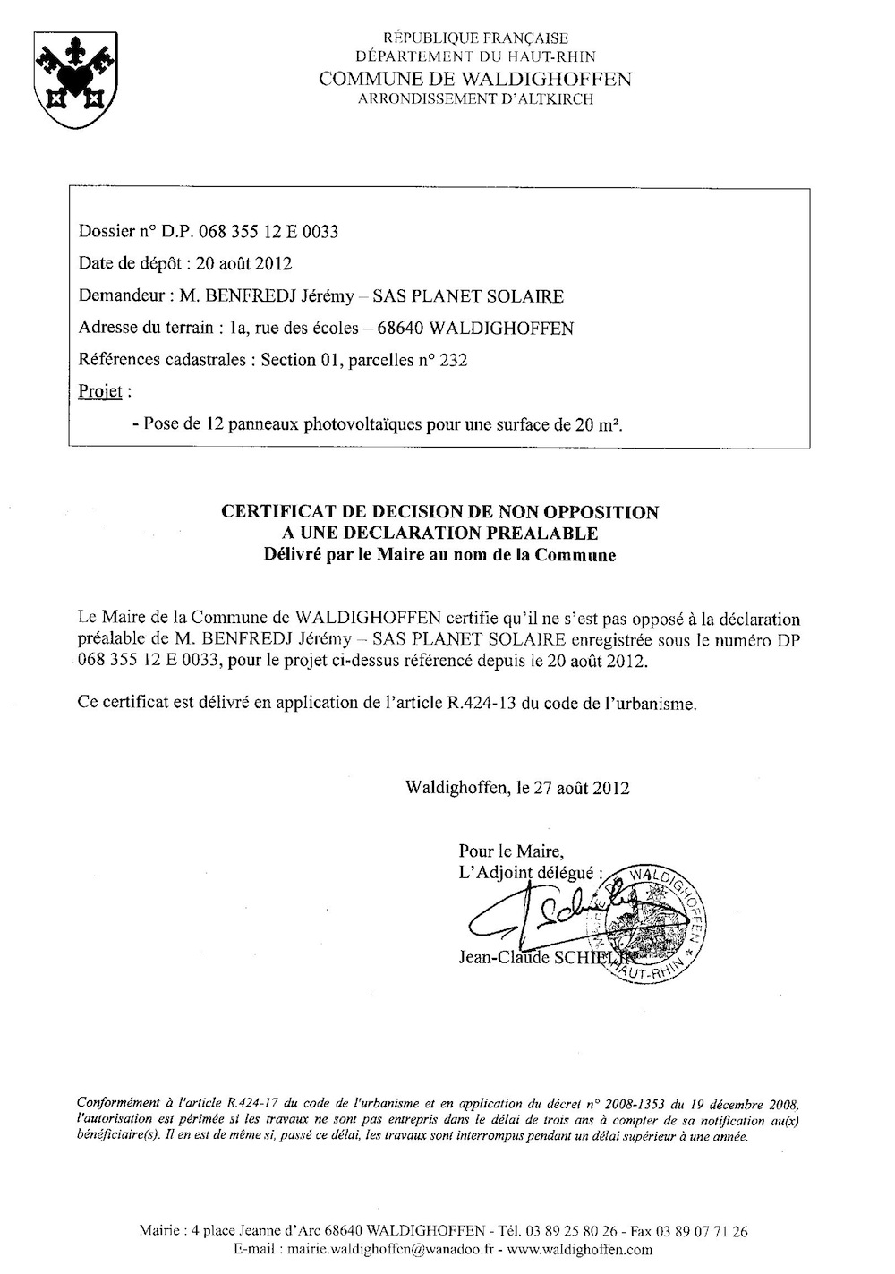 Certificat de non opposition n° DP 068 355 12 E 0033 au profit de la SAS Planet Solaire pour un projet à Waldighoffen, 1a rue des écoles.