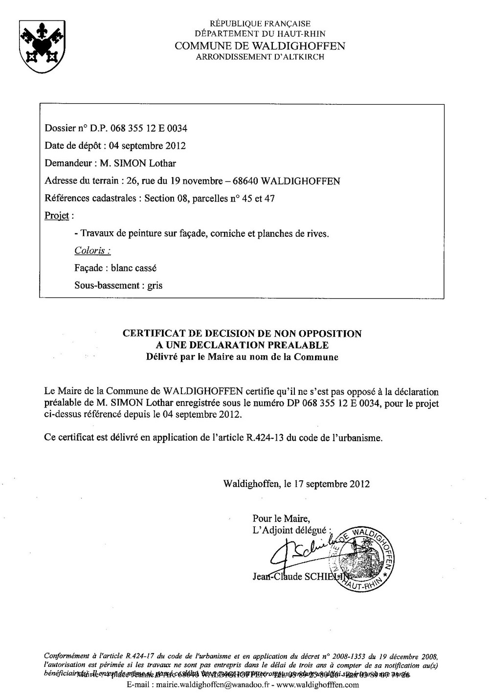 Certificat de non opposition pour la déclaration préalable n° DP 12E0034 déposé par M. Simon Lothar domicilié à Waldighoffen.