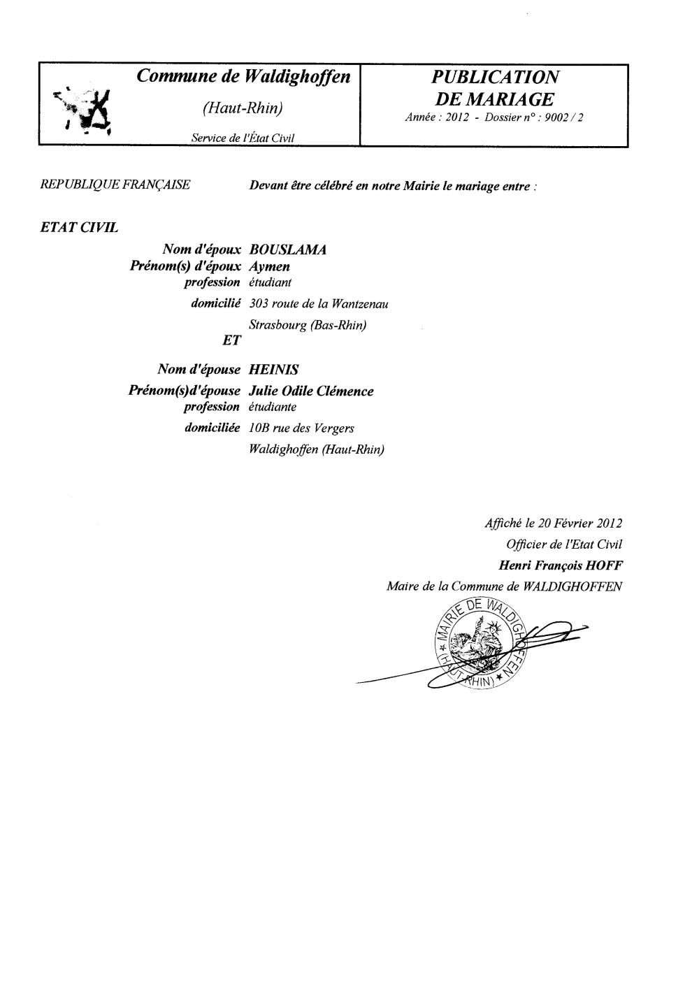Vous êtes ici : Accueil Mairie Affichage public Annexes affichage public 2012 Publication de mariage M. BOUSLAMA et Mlle HEINIS
