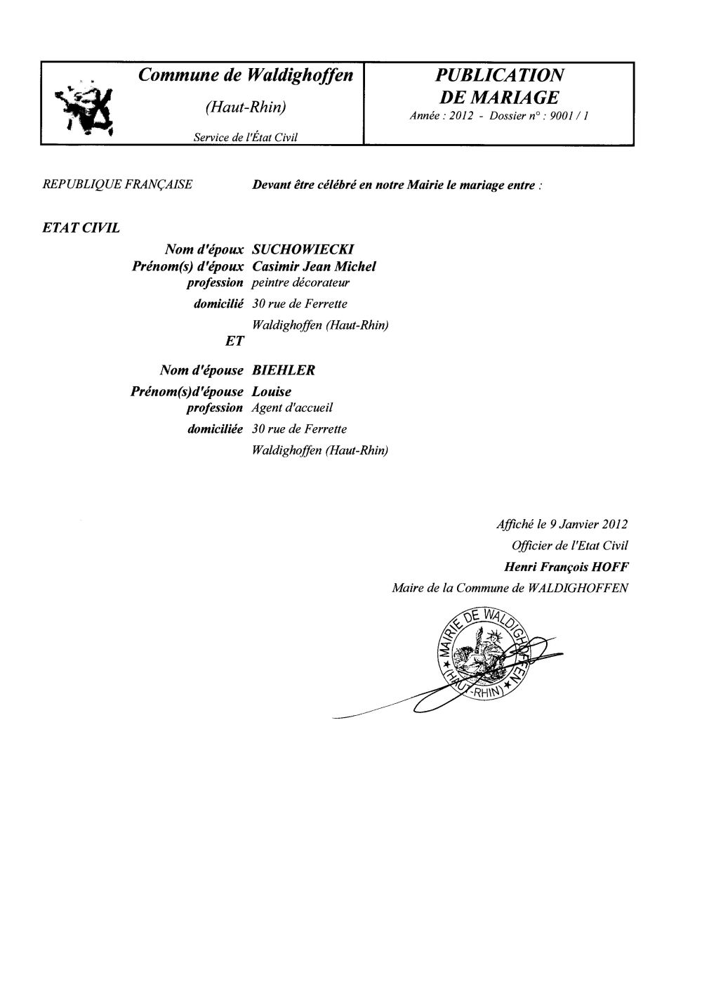 Vous êtes ici : Accueil Mairie Affichage public Annexes affichage public 2012 Publication de mariage M. SUCHOWIECKI et Mlle BIEHLER