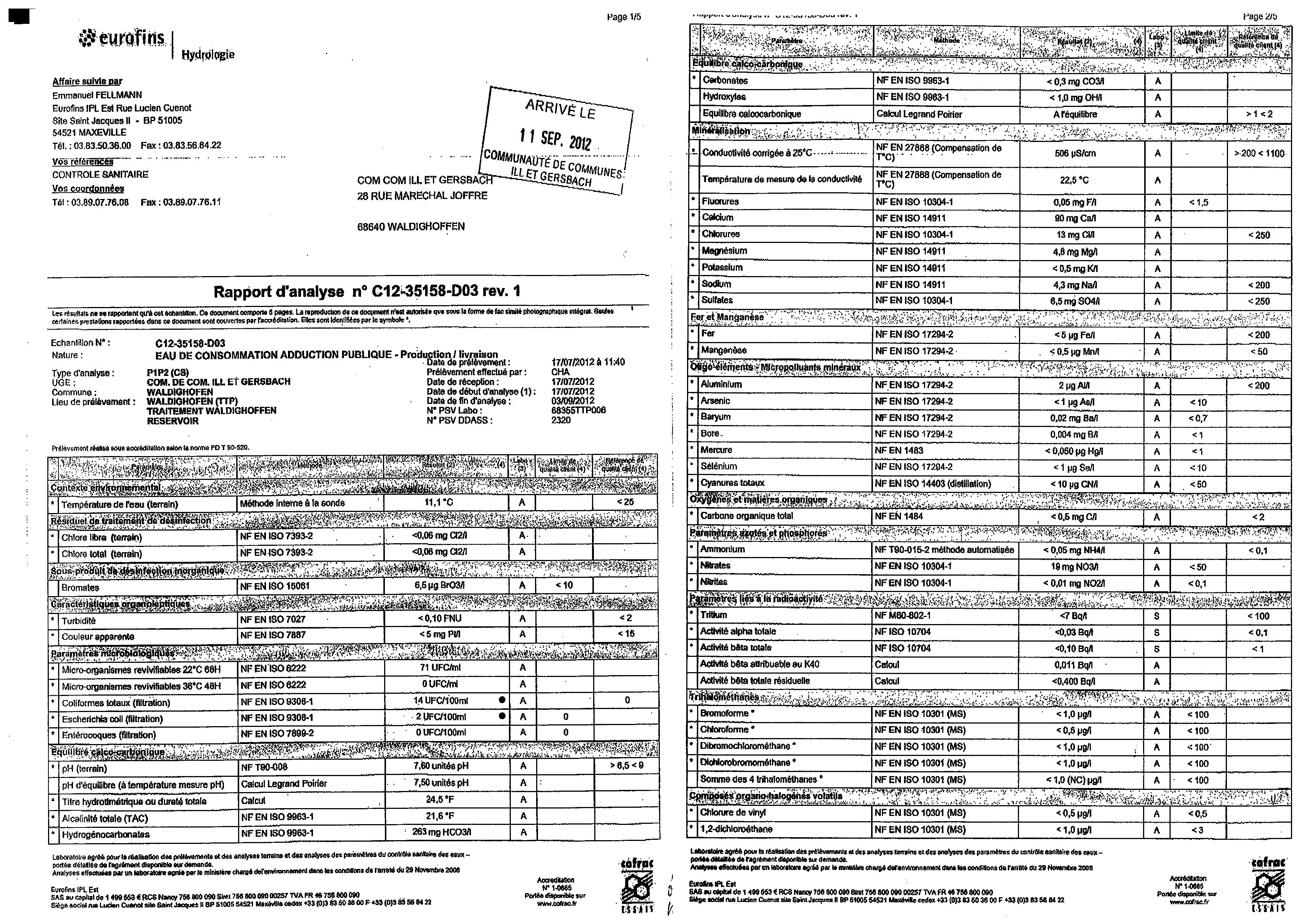 Rapport d'analyse d'eau potable n°C12-35158-D03 du 07/09/2012