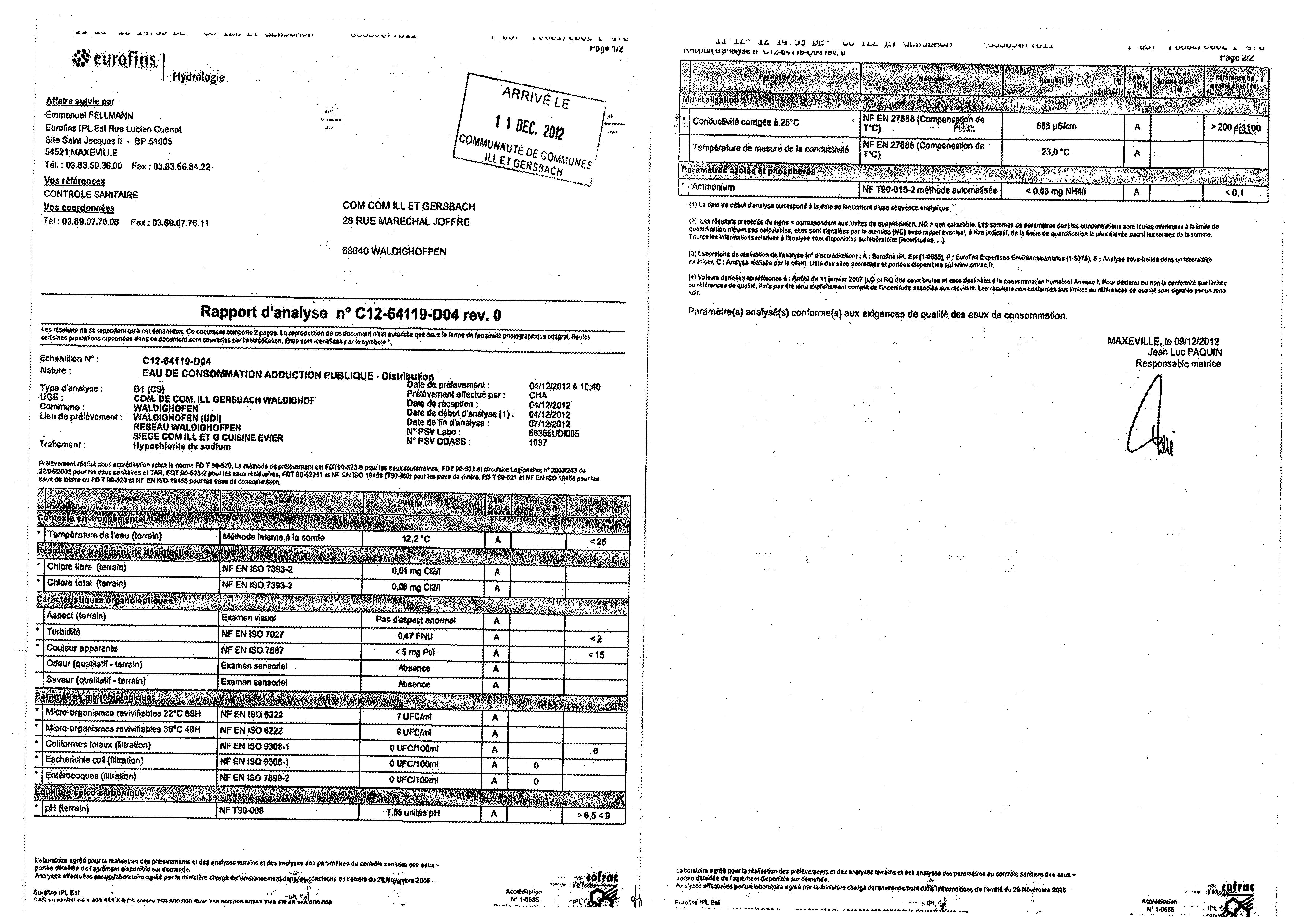 Rapport d'analyse d'eau potable n°C12-64119-D04 du 09/12/2012