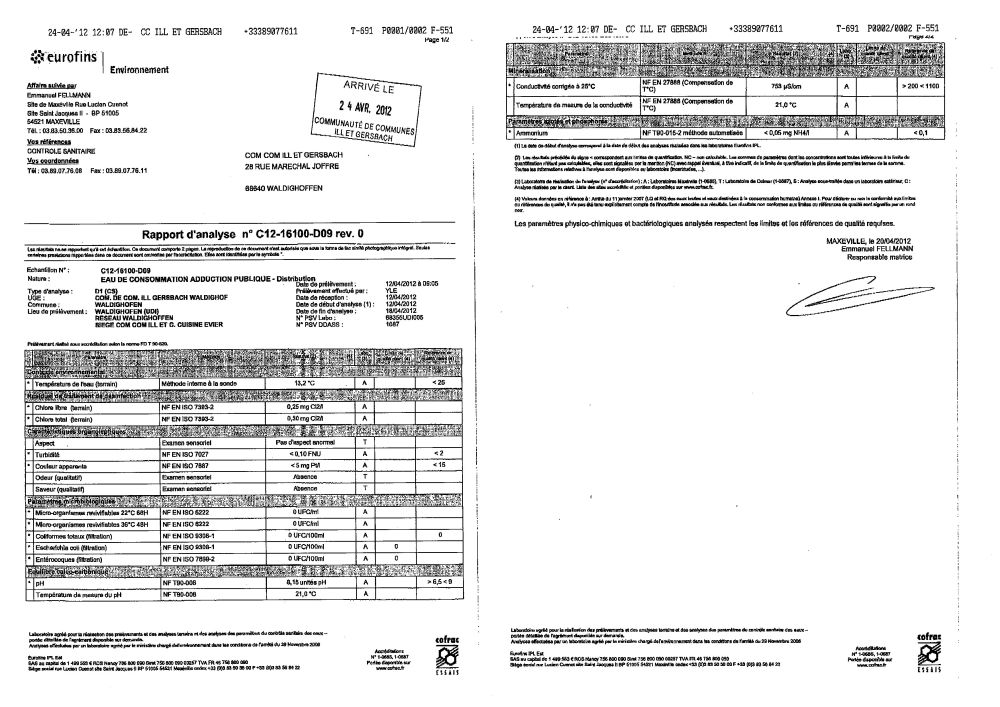 Rapport d'analyse d'eau potable n°C12-16100-D09 du 20/04/2012