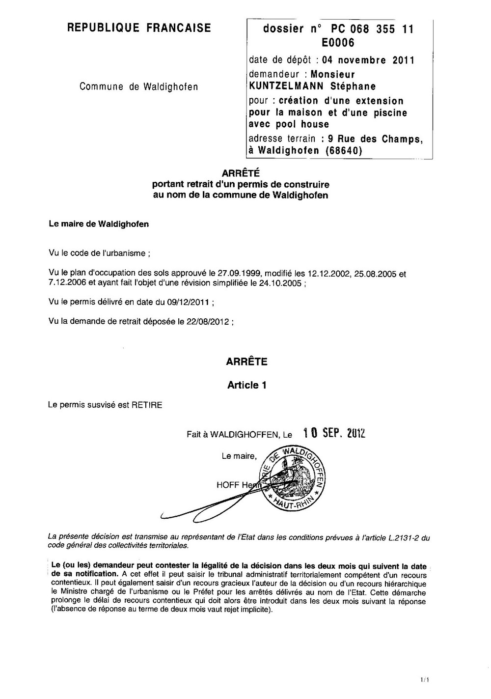 Vous êtes ici : Accueil Mairie Affichage public Annexes affichage public 2012 Retrait PC11E0006 Kuntzelmann