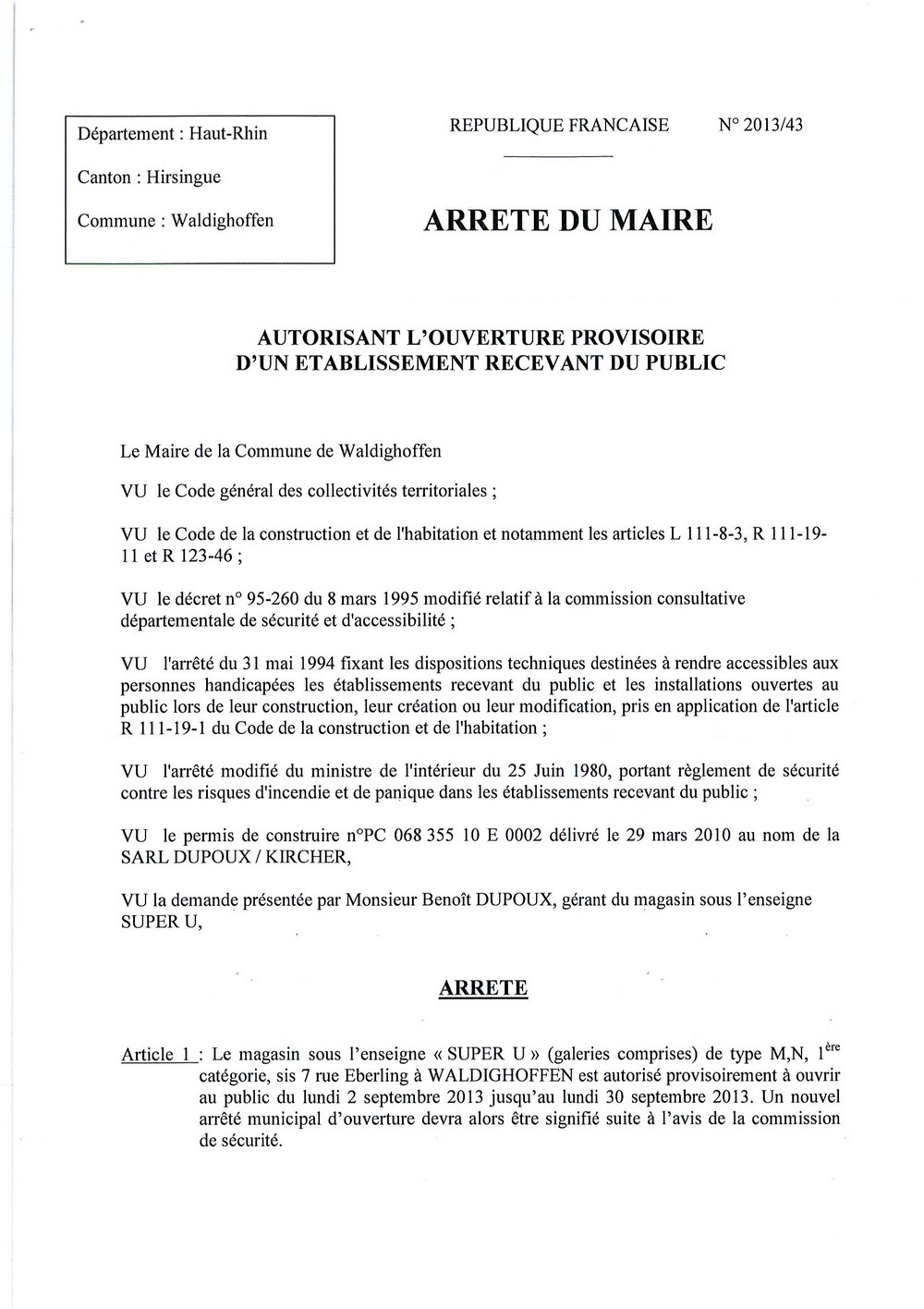 Deuxième page de l'arrêté du Maire n°2013/43 autorisant l'ouverture du Super U.