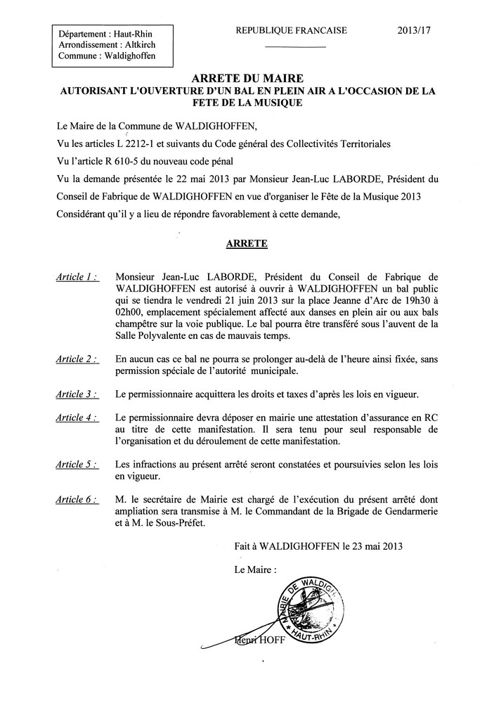 Arrêté 2013.17 - Fête de la musique