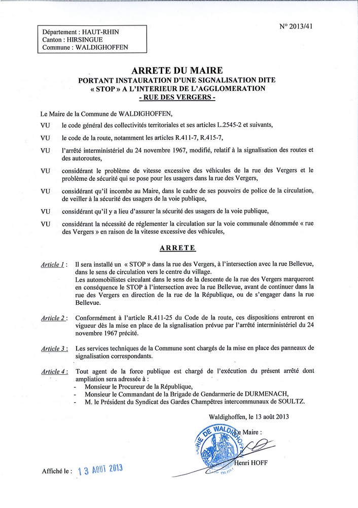 Arrêté 2013/41 - panneau STOP rue des Vergers