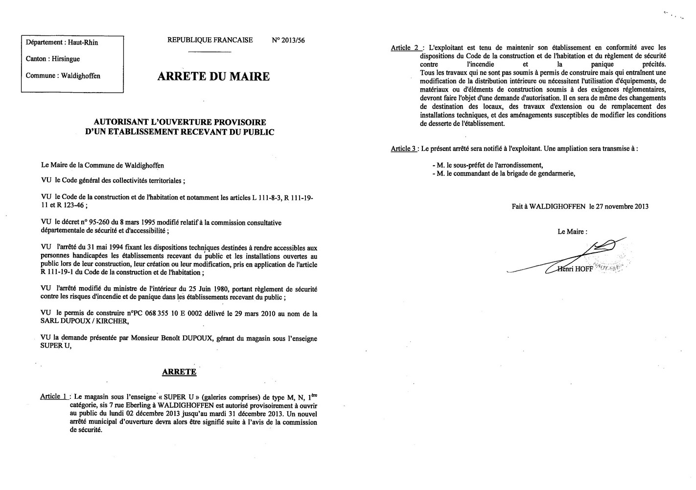 Arrêté n° 2013/56 autorisant l'ouverture provisoire de l'établissement Super U à Waldighoffen jusqu'à l'avis de la commission de sécurité.
