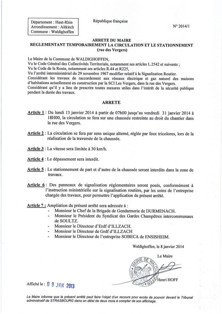Arrêté n° 2014/1 règlementant temporairement la circulation et le stationnement dans la rue des Vergers du lundi 13 au vendredi 31 janvier 2014