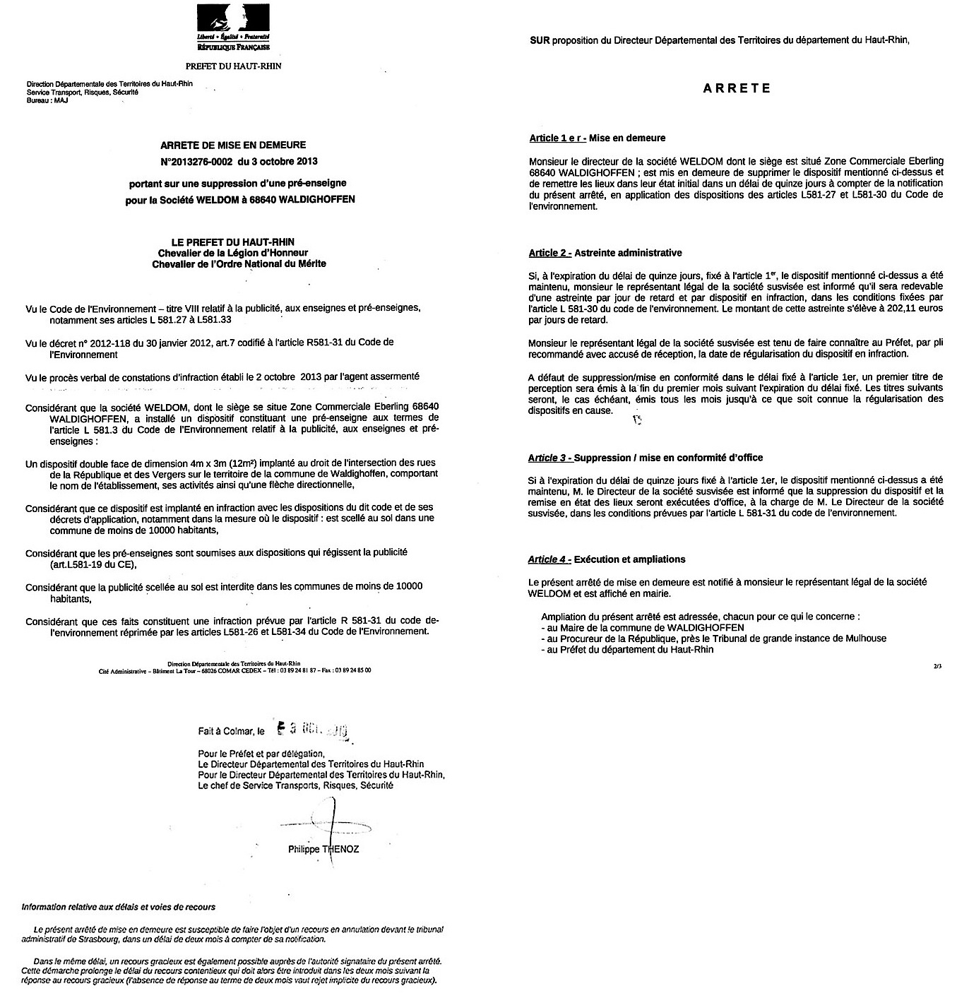 Arrêté de mise en demeure portant sur la suppression d'une pré-enseigne pour la Société WELDOM à Waldighoffen