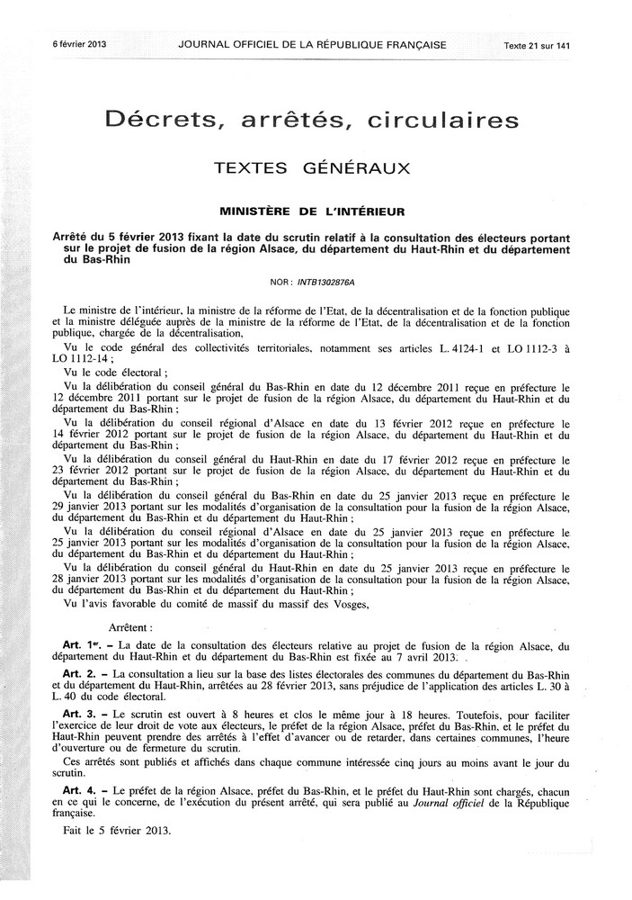 Arrêté du 05 février 2013 fixant la date du scrutin relatif à la consultation des électeurs portant sur le projet de fusion de la Région Alsace.
