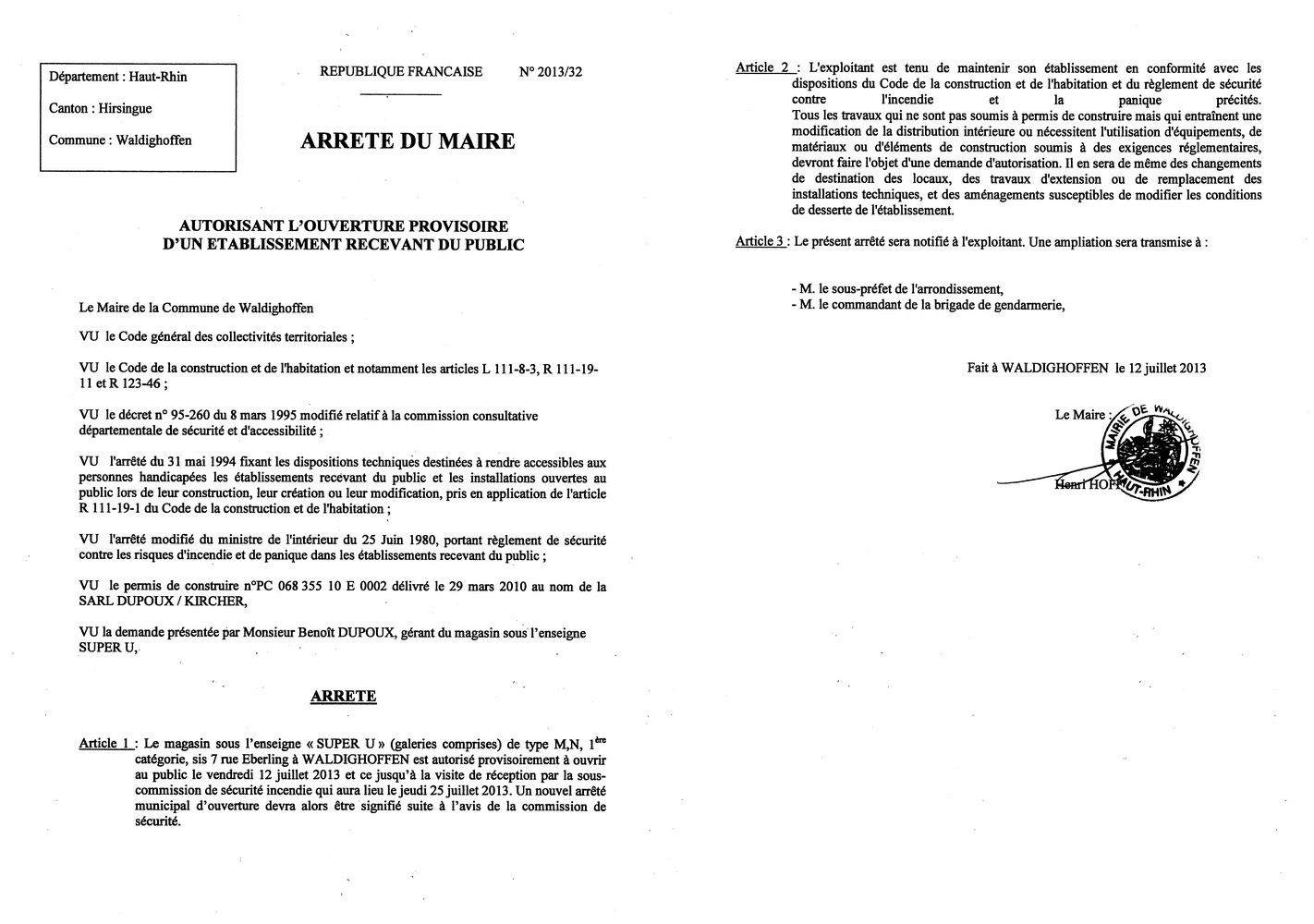 Arrêté autorisant l'ouverture provisoire du magasin "SUPER U" à Waldighoffen