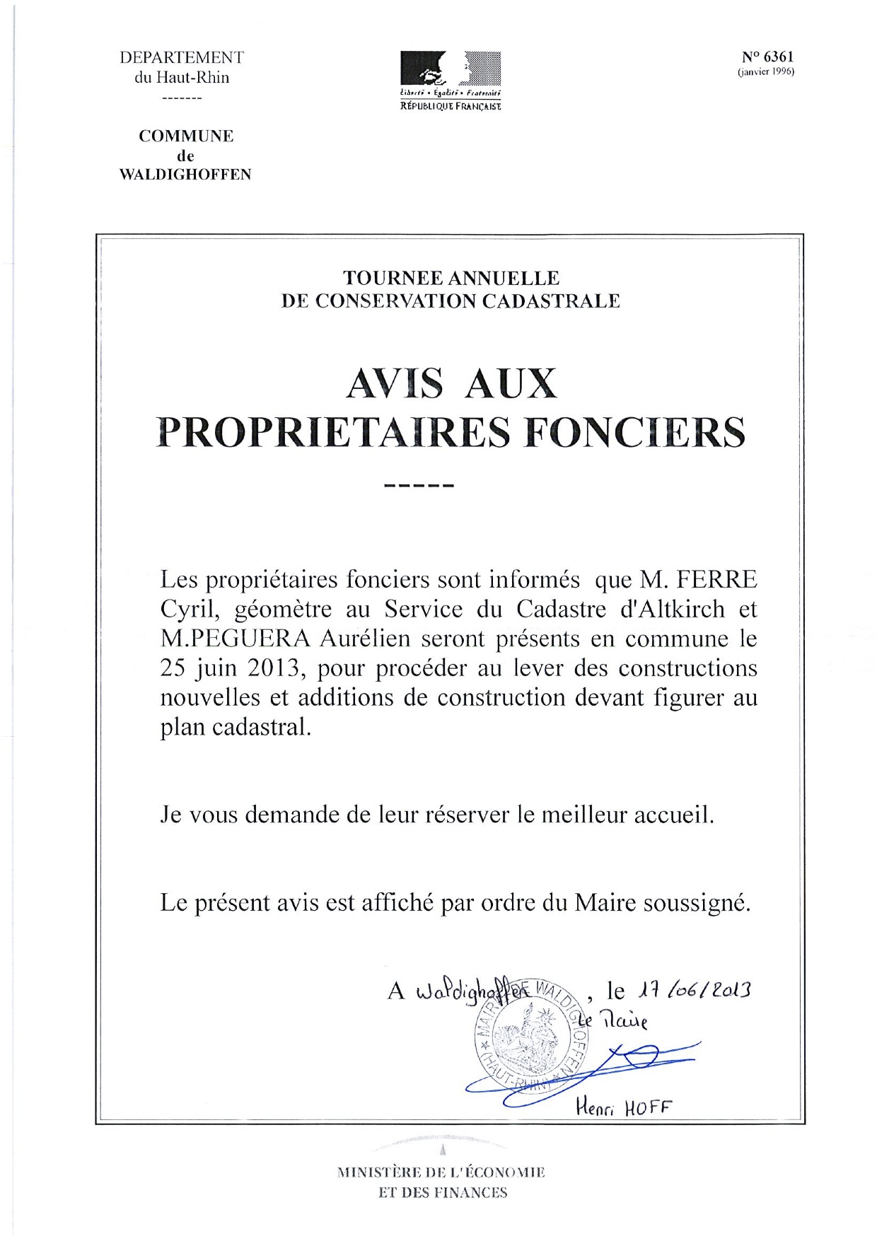 Avis aux propriétaires foncier pour la tournée de conservation cadastrale à Waldighoffen pour l'année 2013.