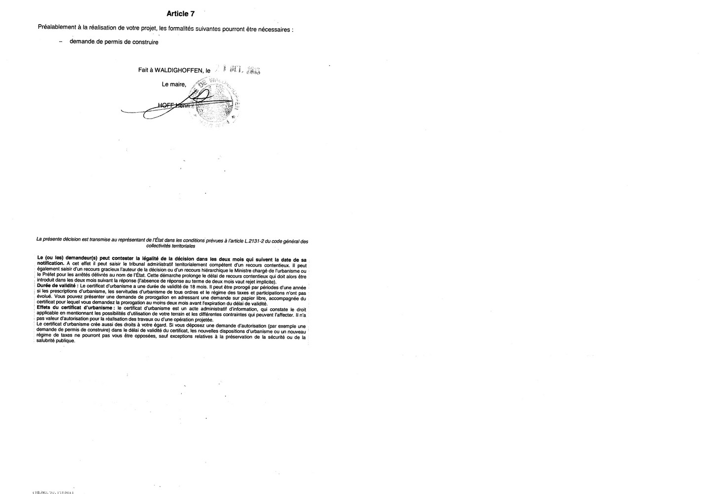 Certificat d'urbanisme délivré à Monsieur LITZLER