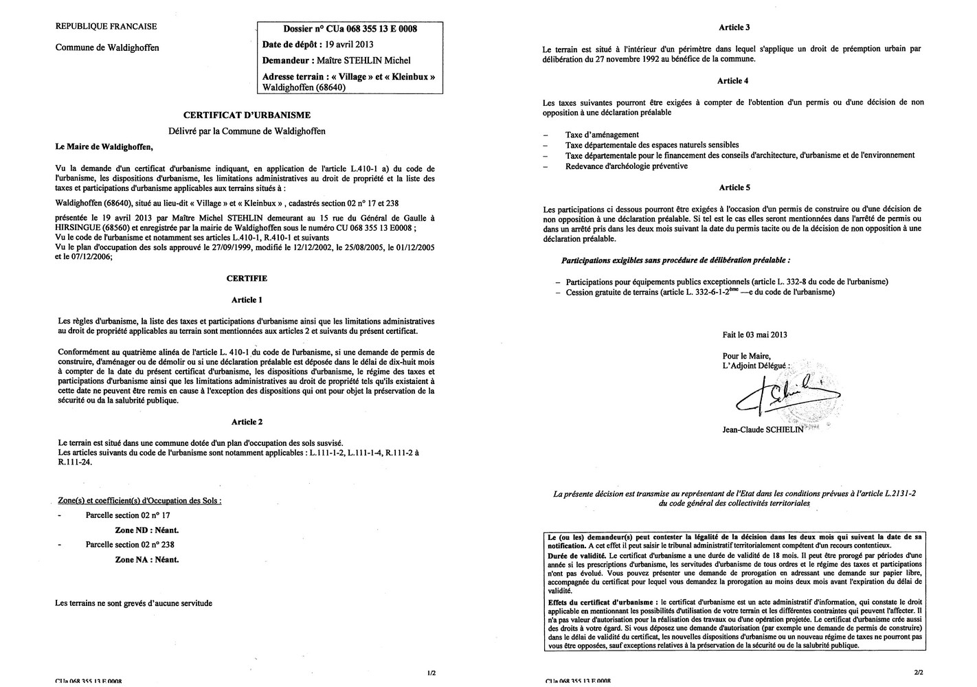 Certificat d'urbanisme n°13E0008 - Me STEHLIN