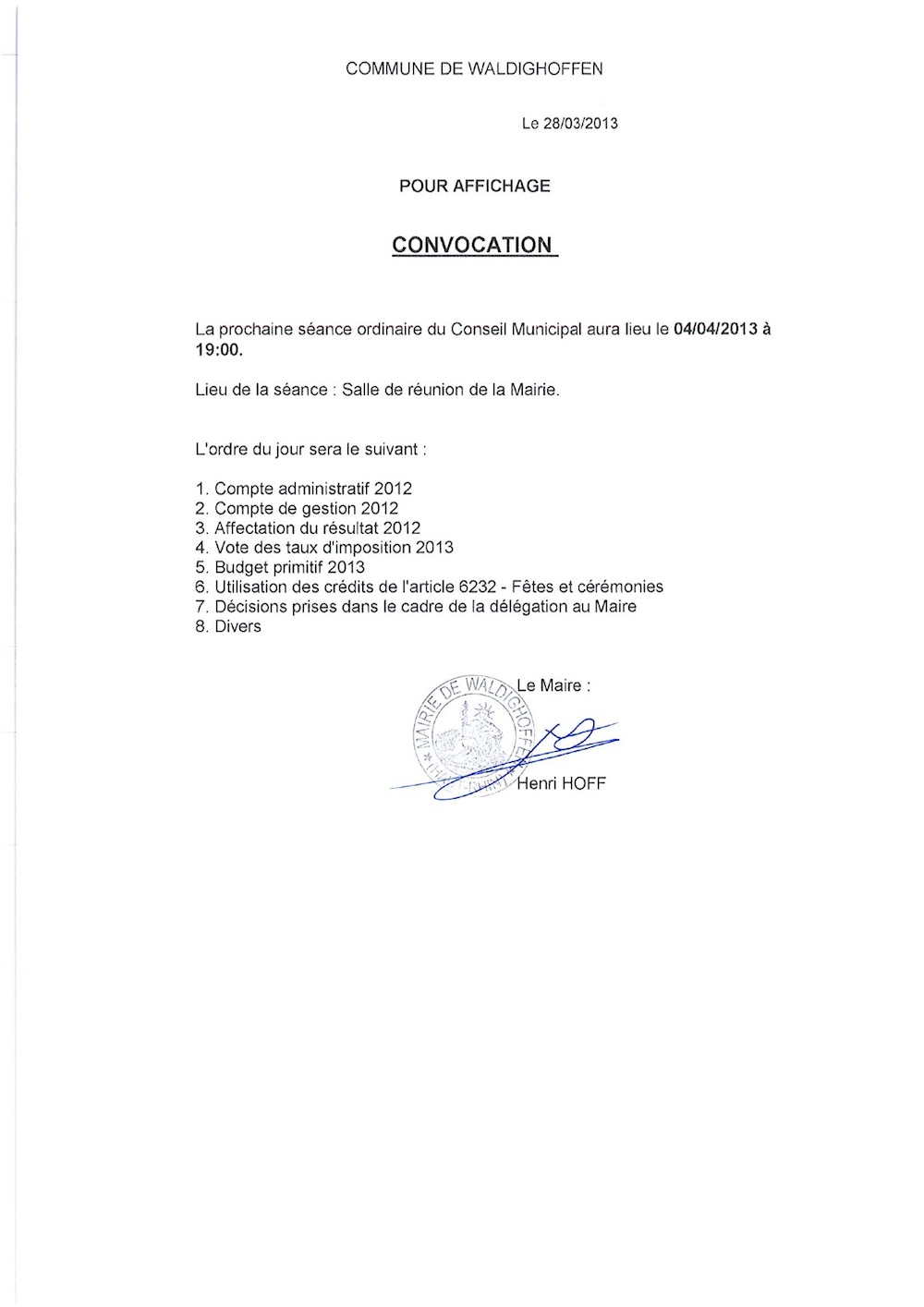La convocation du Conseil de Municipal pour une réunion le 4 avril 2013.