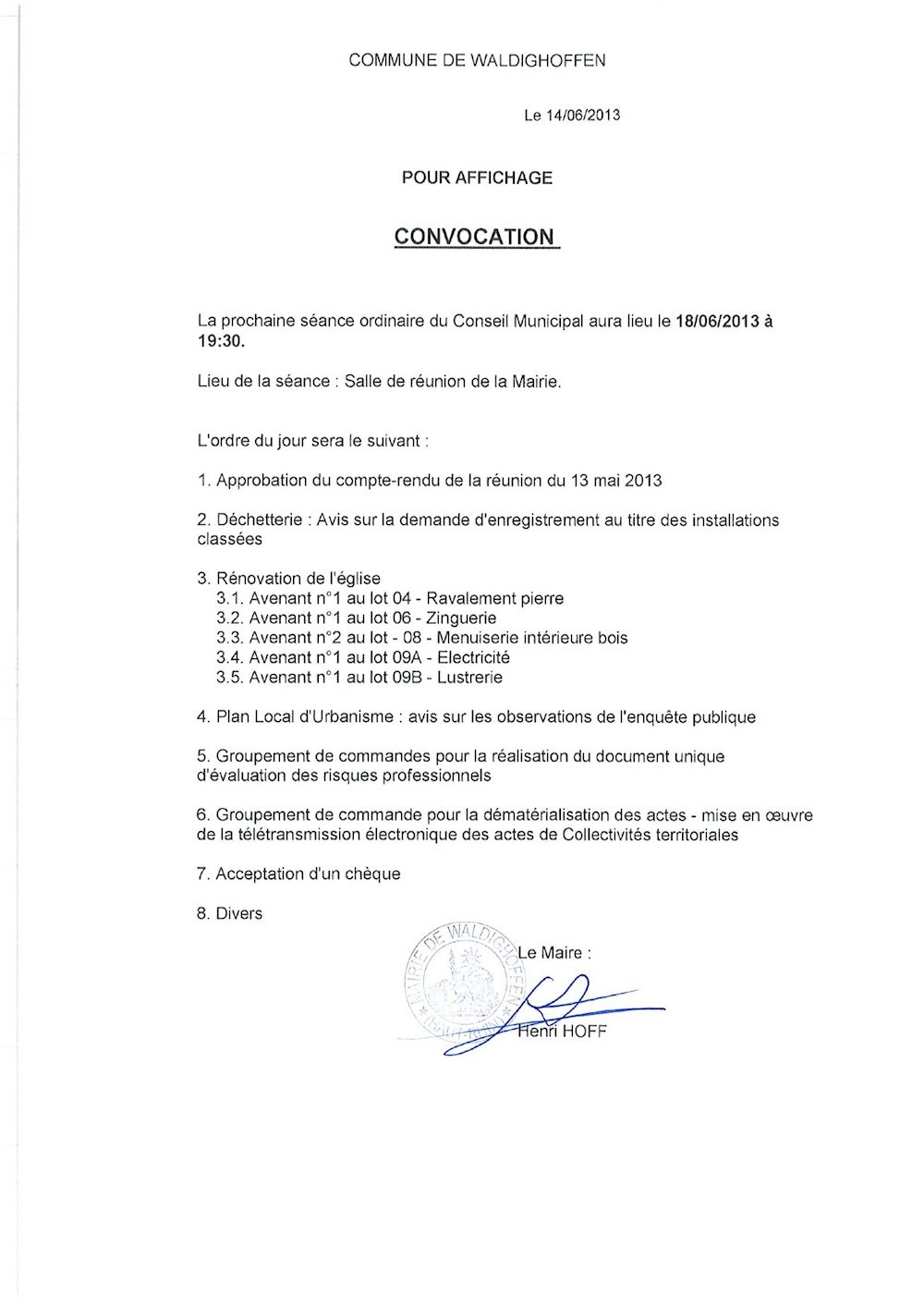 Convocation du conceil municipal de Waldighoffen le 18 juin 2013.