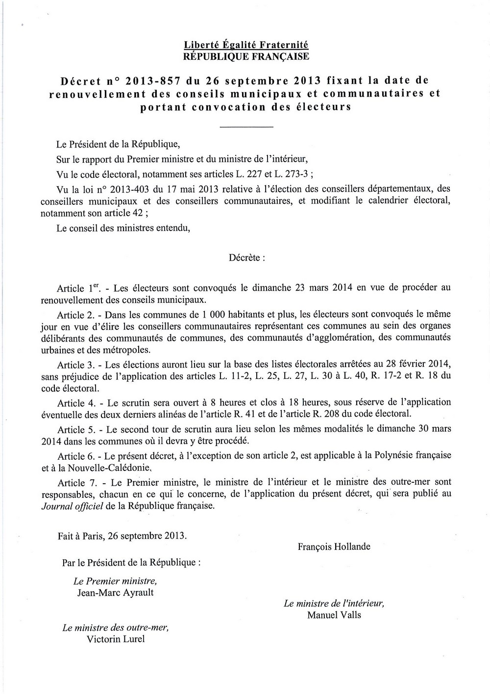 Décret 2013-857 du 26/09/13 portant convocation des électeurs le 23 et 30 mars 2014.